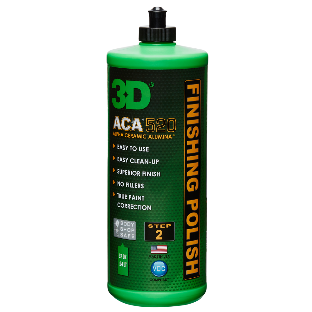 ACA 520 FINISHING POLISH is ook extreem veelzijdig en bevat "Geen" schadelijke oplosmiddelen, kerosine of OSHA-gereguleerde KRISTALLIJN SILICA. ACA 520 corrigeert snel elk geverfd oppervlak en laat een hologramvrije, glasachtige afwerking achter zonder toevoeging van vulstoffen, wat de mogelijkheid van "dye-back" elimineert.