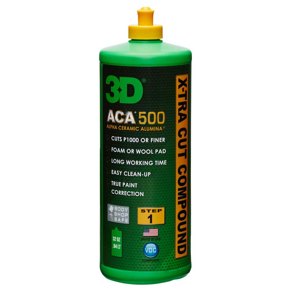 3D ACA 500 X-Tra Cut Compound is extreem veelzijdig. 3D ACA™ 500 is agressief genoeg om de hardste nieuwe keramische blanke lakken te corrigeren en is zo verfijnd dat extreem zachte blanke lakken niet te veel niet teveel lakdikte kwijt raken. Het is gemakkelijk te gebruiken, gemakkelijk schoon te maken, is zonvriendelijk en bevat "geen" schadelijke oplosmiddelen, kerosine of door OSHA gereguleerde CRYSTALLINE SILICA. 3D ACA 500 X-Tra Cut Compound kan perfect worden gecombineerd met een WOL- of FOAM-pad en kan gebruikt met een roterende polijstmachine of een Dual Action polisher.