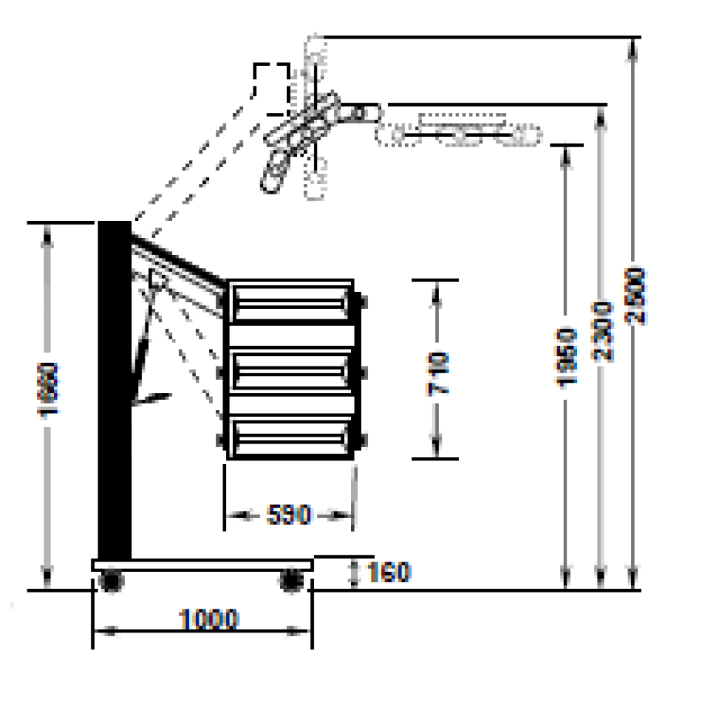 - Robuust staal geconstrueerd stabiel frame, voorzien van achterwielblokkeerwielen.