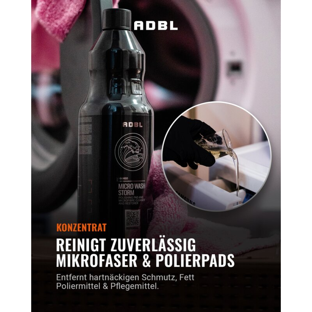 ADBL Micro Wash Storm is een zeer effectieve reiniger, speciaal samengesteld voor het grondig reinigen en regenereren van microvezelproducten en polijstpads.