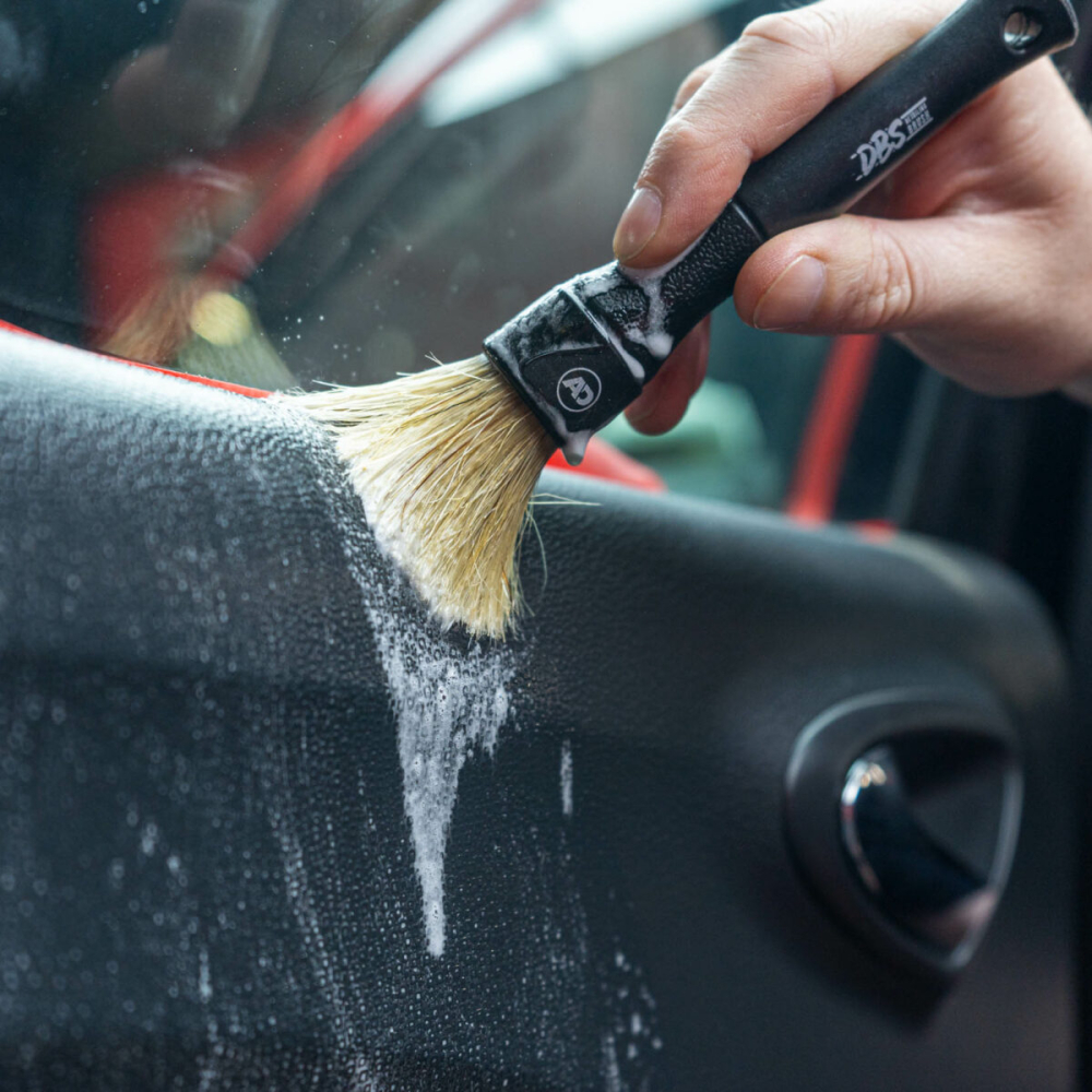 Bij sterke vervuiling op getextureerde kunststoffen direct op het oppervlak spuiten en inwerken met een geschikte interieur-/detailborstel en het resulterende schuim wegvegen met een microvezeldoek.