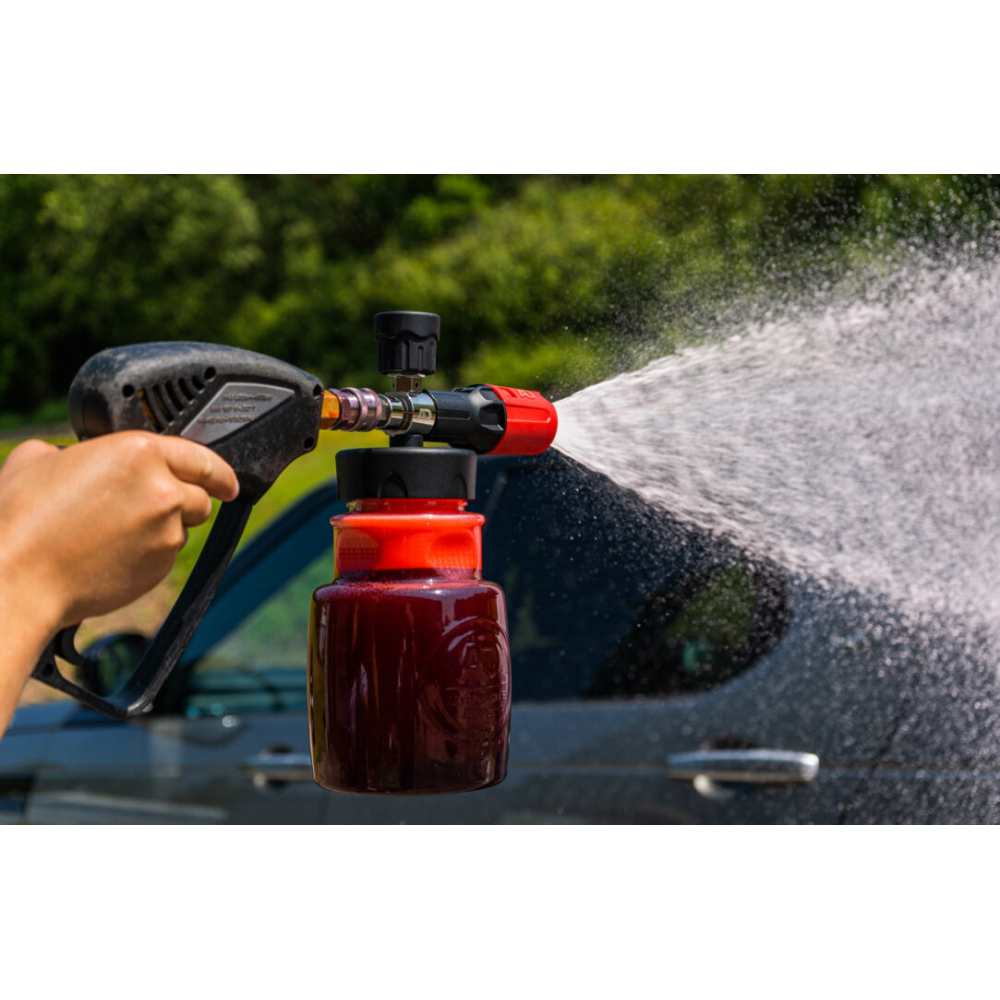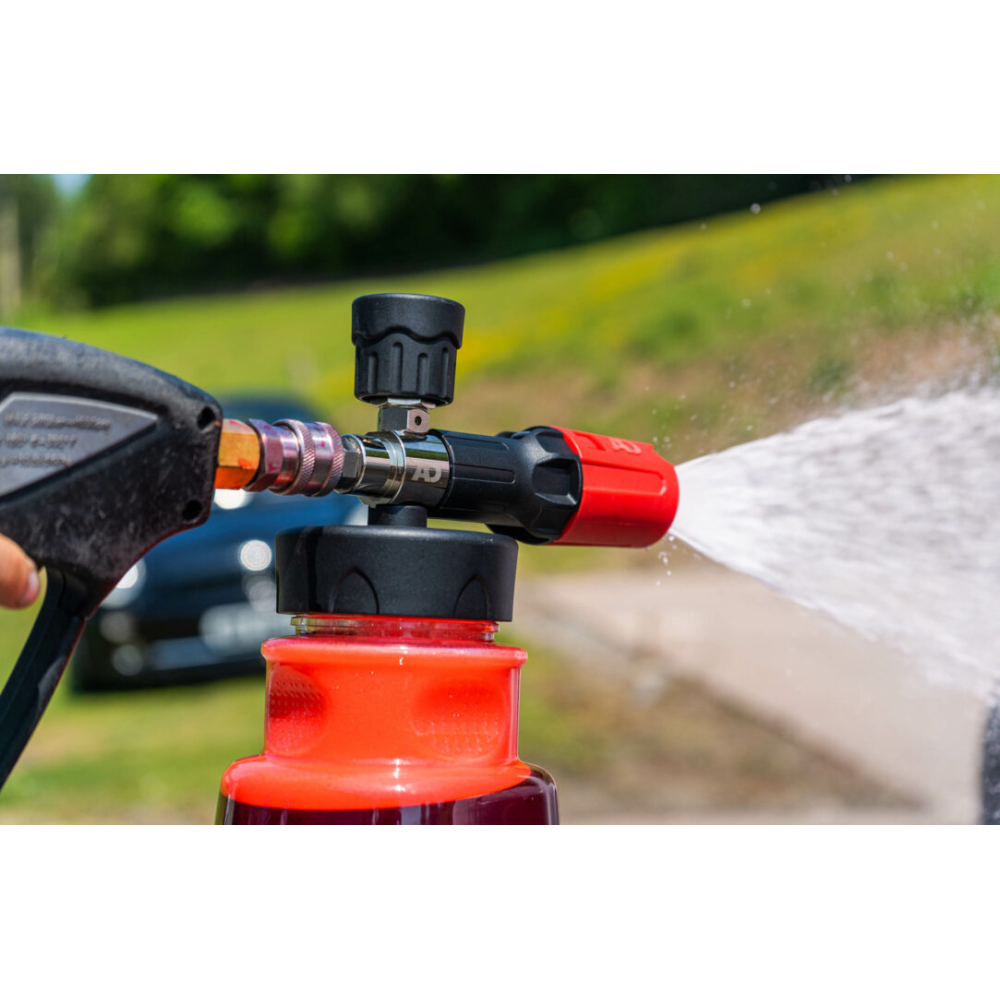 Met een 1/4″ aansluiting is deze premium foamlance klaar om aan bijna elke hogedrukreiniger te worden bevestigd. De bovenkant heeft een gekalibreerde luchtinlaatklep om eenvoudig uw schuimverdunningsverhouding aan te passen.