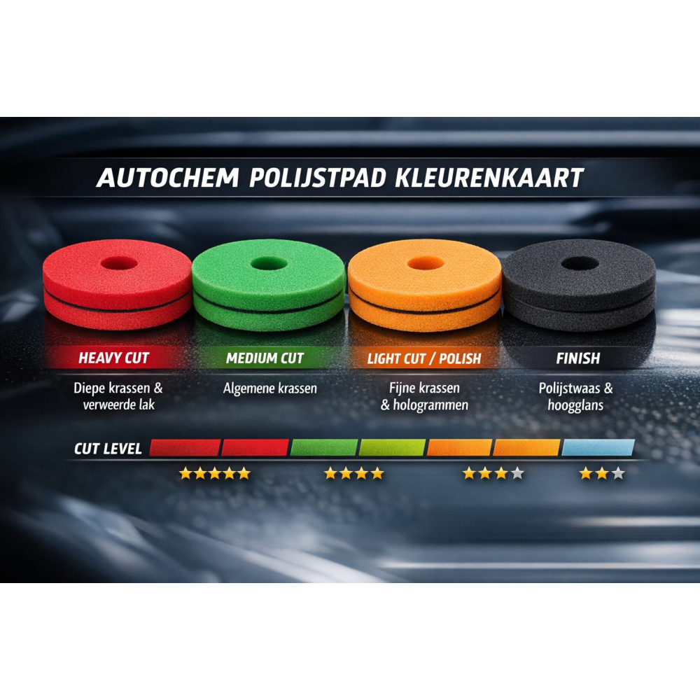 Met deze complete 4-pack beschikt u direct over alle pads voor een volledig polijstproces – van zware lakcorrectie tot hoogglans finish.