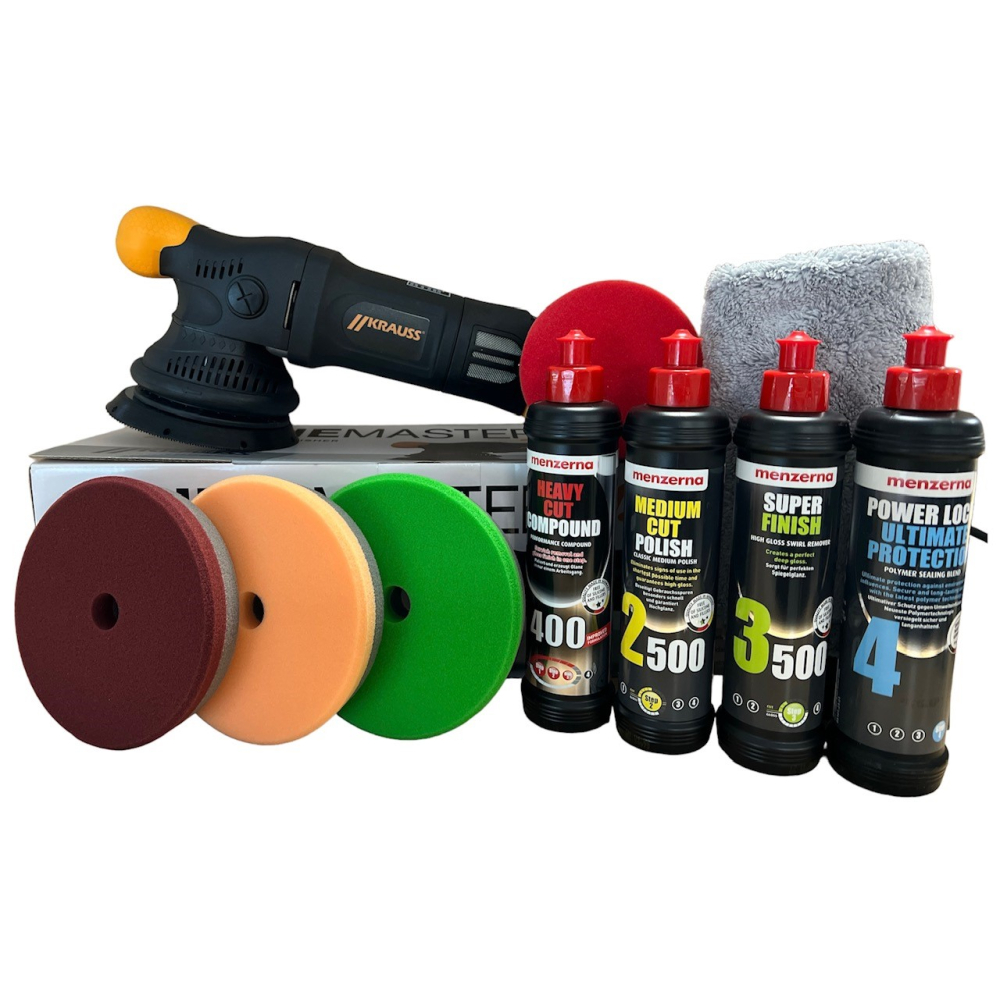 In deze startset vind je niet alleen de dual action polijstmachine, maar ook handige toebehoren. Zo krijg je drie passende Autochem polijstpads en drie Menzerna polijstcompounds.