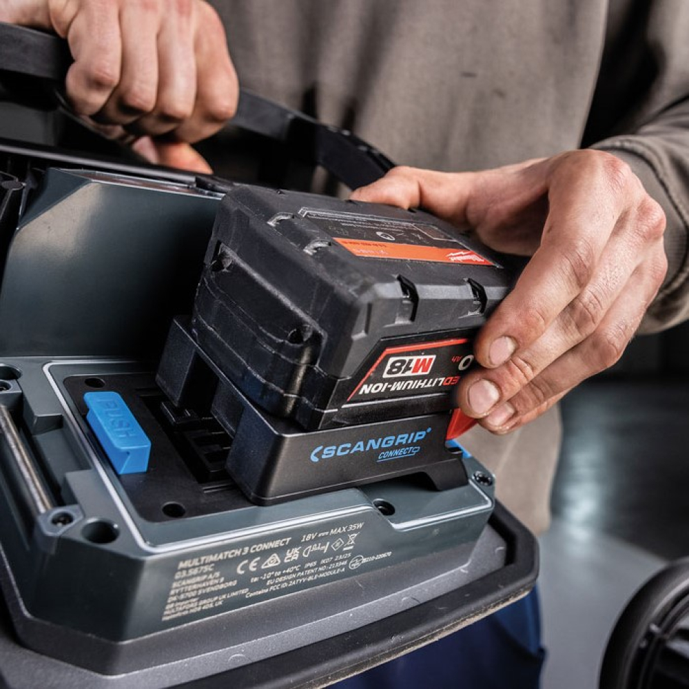 Scangrip heeft een unieke serie connectors ontwikkeld die compatibel zijn met 18V accu's van verschillende merken elektrisch handgereedschap, zoals Makita, maar ook Festool en Flex