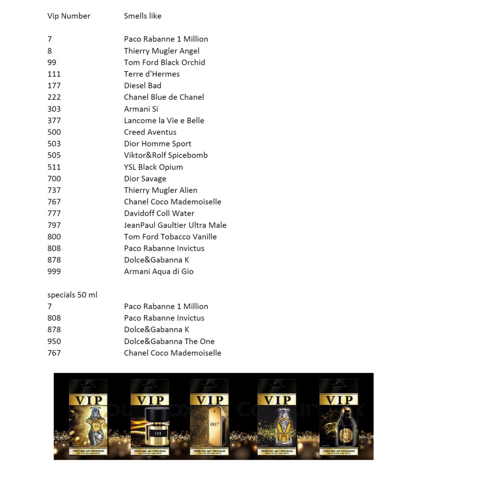 De VIP serie is een lijn autoparfums gebaseerd op de allerbeste merken parfums.